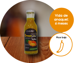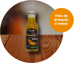 La pulpa jugosa de la piña, de exótico aroma y refrescante sabor dulce y ácido, dará un exquisito sabor a tus ensaladas o carnes. El aderezo Chilmolli esta elaborado con un alto porcentaje de pulpa natural. Libres de saborizantes y endulzantes artificiales.